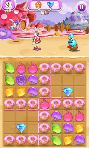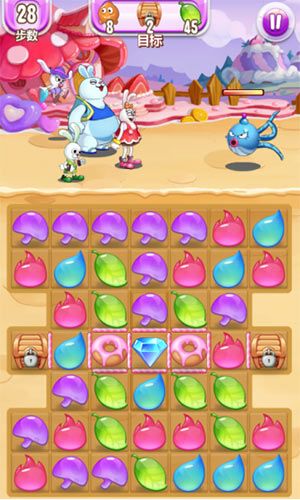第9关,使用横向消除和周边变色消除会更快的完成关卡任务。要求:20步内消除5个贪吃怪和2颗钻石。这一关相对还是很简单的,钻石就在路径之内的地方,只要消除了障碍甜甜圈即可通关。第10关,基本上阵有红色、蓝色、紫色的兔子,需要蓝色元素竖向攻击,因为有一个钻石卡在了缝里。要求:20步内消除5个贪吃怪和1颗钻石。上手很简单,竖着就可以直接消除,剩下的就是5个贪吃怪了,加油吧大兄弟。第11关,三