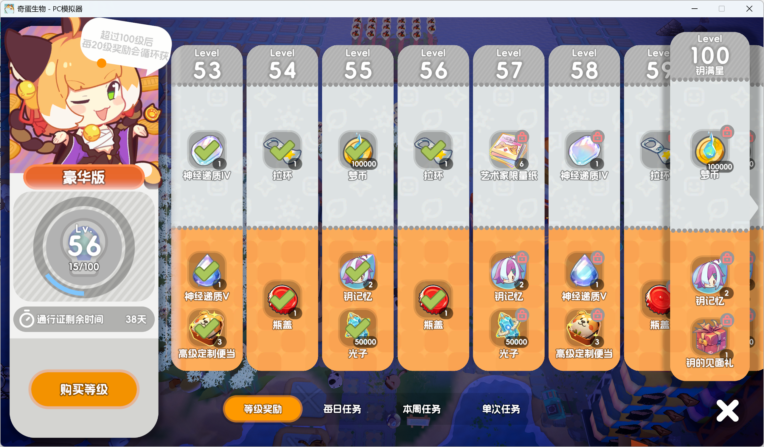 一次性任务是18个一周周常+每日做完是7级那么40天+一次性满勤的情况下大概就是120级左右在后续不调整经验的情况下 氪豪华版的级别差不多就是这样了普通版和免费版也可以自己计算一下然后附上120级等级的奖励大家自己核算一下是否氪豪华版个人感觉任务更新之后128的价格去换算游戏内的物品还算可以接受但是! 我要说但是了 如果策划或者工作室的人员看这篇帖子的话有以下建议后面的通行证尽量利