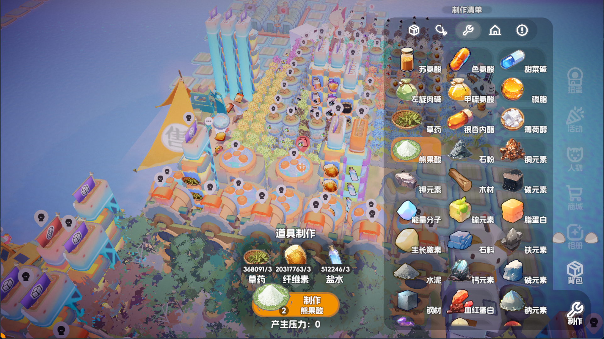 花岛分三层,用大佬常说的,就是花一,花二,花三,三个区域。玩法就是你平常种的花,花的产物可以在这合成更高级的东西,合成金色的浓缩花精可以换(V级糖,木,石场,以及V级的糖加工场,木头加工厂,石头加工厂,以及对应的二倍图纸包括,二倍果糖图纸,二倍纯水图纸,二倍氧图纸,二倍钙图纸),这些东西分别在花一,花二,花三分别解锁。还能换一些小东西包括降压药,黑色白色各种类型大花和金币,以及重要的喵娘碎片。说