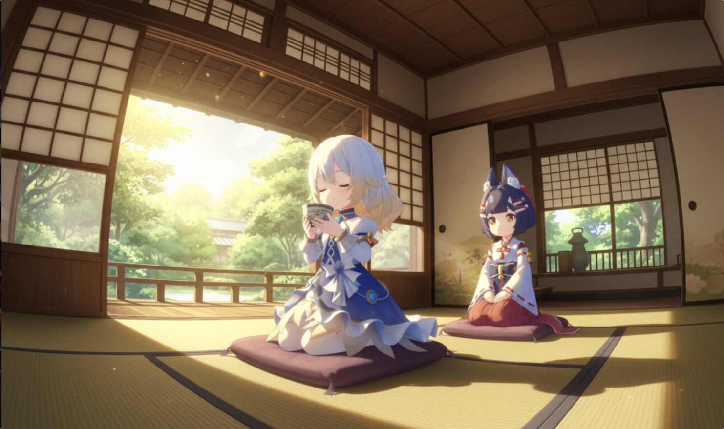 清晨的日光穿过东京町屋的格子窗,在榻榻米上落下细碎的木纹光影。青柚跪坐在软垫上,双手捧着茶碗,蓝白裙摆垂在膝边,像一片安静的云。 神乐一身巫女服端坐在右侧,暗红的裙摆在暖光里泛着绒绒的光泽,她阖着眼,指尖轻抵膝头,正随着茶烟默念“静心祈愿”的口诀。庭院里的樟树沙沙作响,风穿过廊下,带着远处浅草寺的香火气息。 青柚温热的茶盏熨着掌心,她抬眼看向神乐,对方的睫毛在眼睑下投出一小片阴影,像玄猫蜷