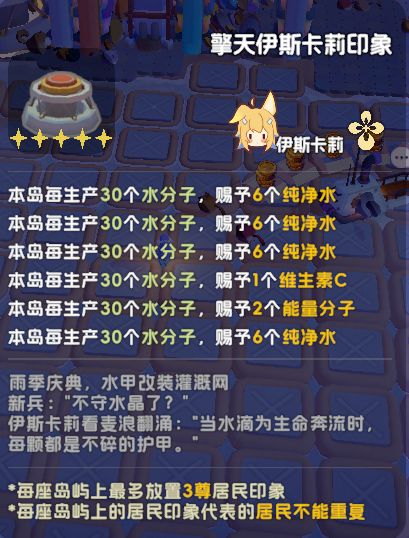 每个岛放的满满登登的全是机器,希望能给机器减减负,多出一些好看的布灵布灵的装饰品装饰一下我的小岛就好了,后期没事情干了收集装饰品研究造景多杀时间啊,现在已经进入每天挂机养老模式,哎…强烈吐糟那个集中营,太贵了,中氪都很难拿到,搞得现在半个岛都得放帐篷,严重影响我研究布局!