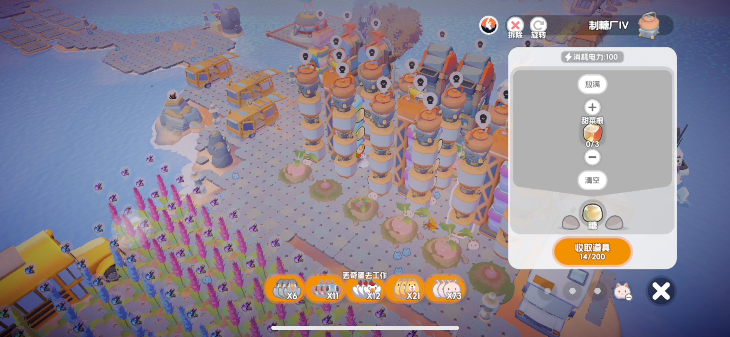 核心玩法围绕“资源管理+自动化养成+岛屿布局”展开。新手开局优先采集树枝、石头、甜菜根,铺设直线道路提升猫咪移动效率,搭建帐篷和食堂避免猫咪冻饿。资源分配遵循“石头≥木头>糖”,各岛功能分区:主岛设高级合成与居住区,树岛建12个伐木厂+雾破炉打造电力中心,石岛配10-12个采石场,蛋岛按比例放置煎蛋器保障食物供给。利用雾破炉实现全图电力联网,是自动化关键。猫咪管理需关注压力值,通过篝火晚会、工