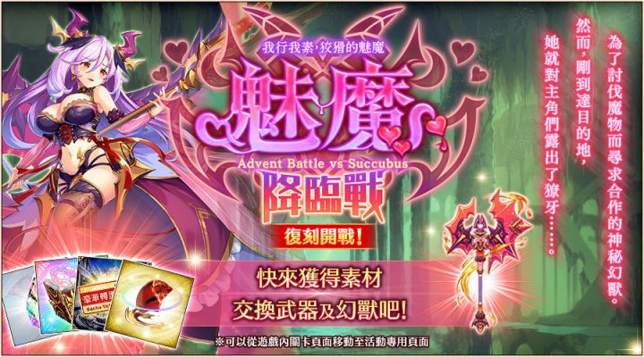 感謝各位平時對《神姬PROJECT》的支持。即日起,將復刻舉辦活動「[妖艷間諜]魅魔降臨戰」!----------◆活動期間2月16日 11:00 ~ 3月2日 11:00◆關於[妖艷間諜]魅魔降臨戰為了討伐魔物而尋求合作的神秘幻獸。然而,剛到達目的地,她就對主角們露出了獠牙……。可以挑戰出現火屬性強敵『[妖艷間諜]魅魔』的活動關卡。多多討伐強敵以獲得豪華報酬吧!◆復刻降臨戰