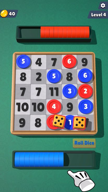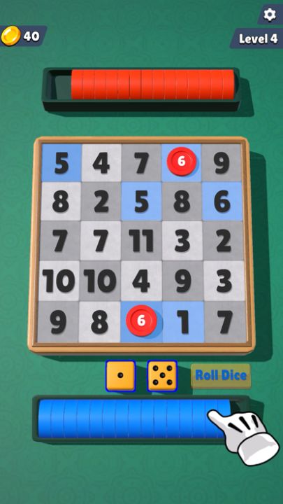 Roll the dice and fill the squares with your chips according to the result. You win if you have 4 chips horizontally, vertically or diagonally.