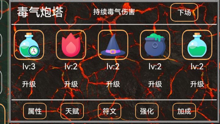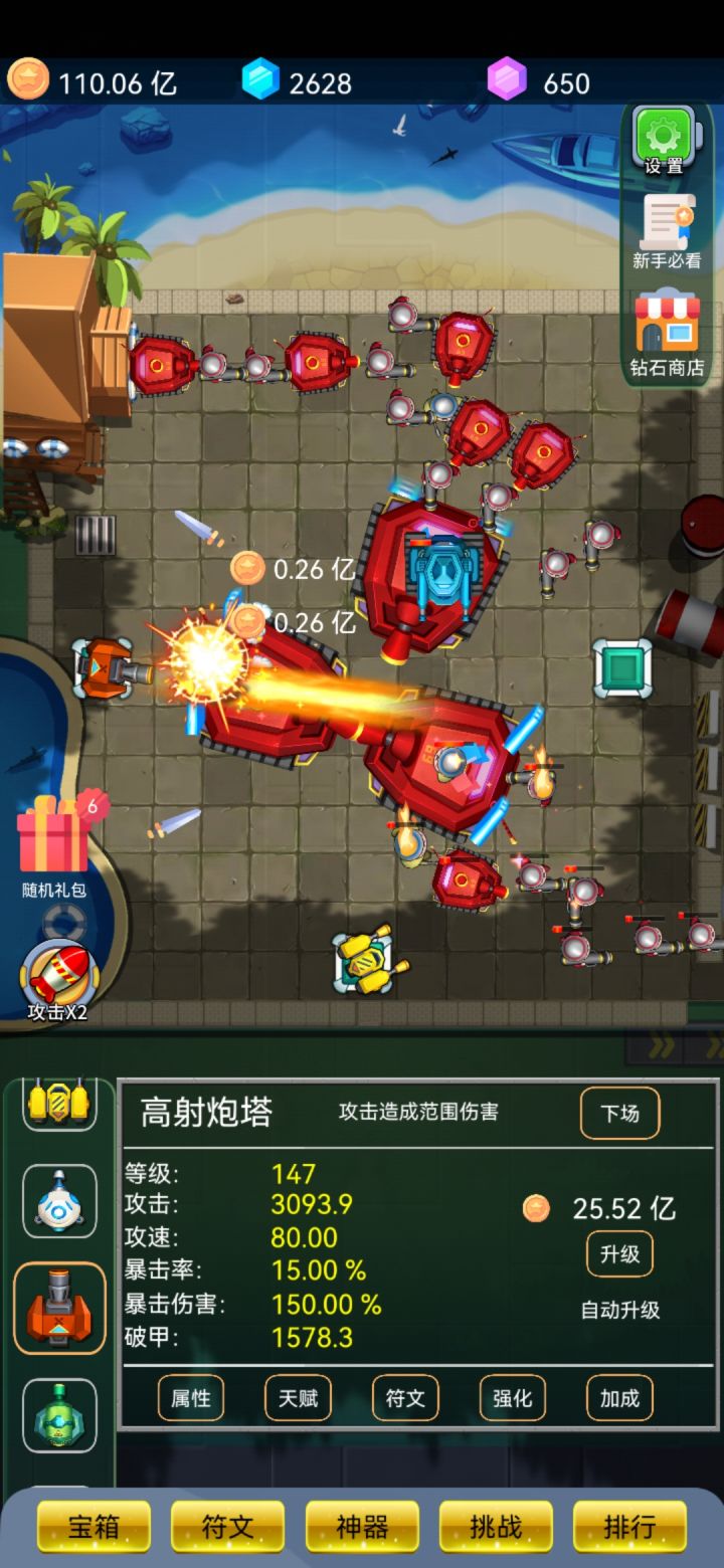 炮塔: 目前只看到五个炮塔不知道以后会不会上新。感觉高射炮是比较给力的。我目前主升这个,第二个减速炮感觉没啥用,可以攒金币直接解锁高射塔。第二是毒塔,伤害比较低但是感染范围很广,可以作为副塔养成。养成顺序: