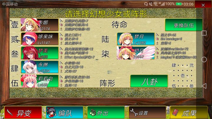 还没打纯狐的用帕秋莉代替,一定要放在第三位。有了纯狐一定(最好)要带上彩虹石,变成木系。