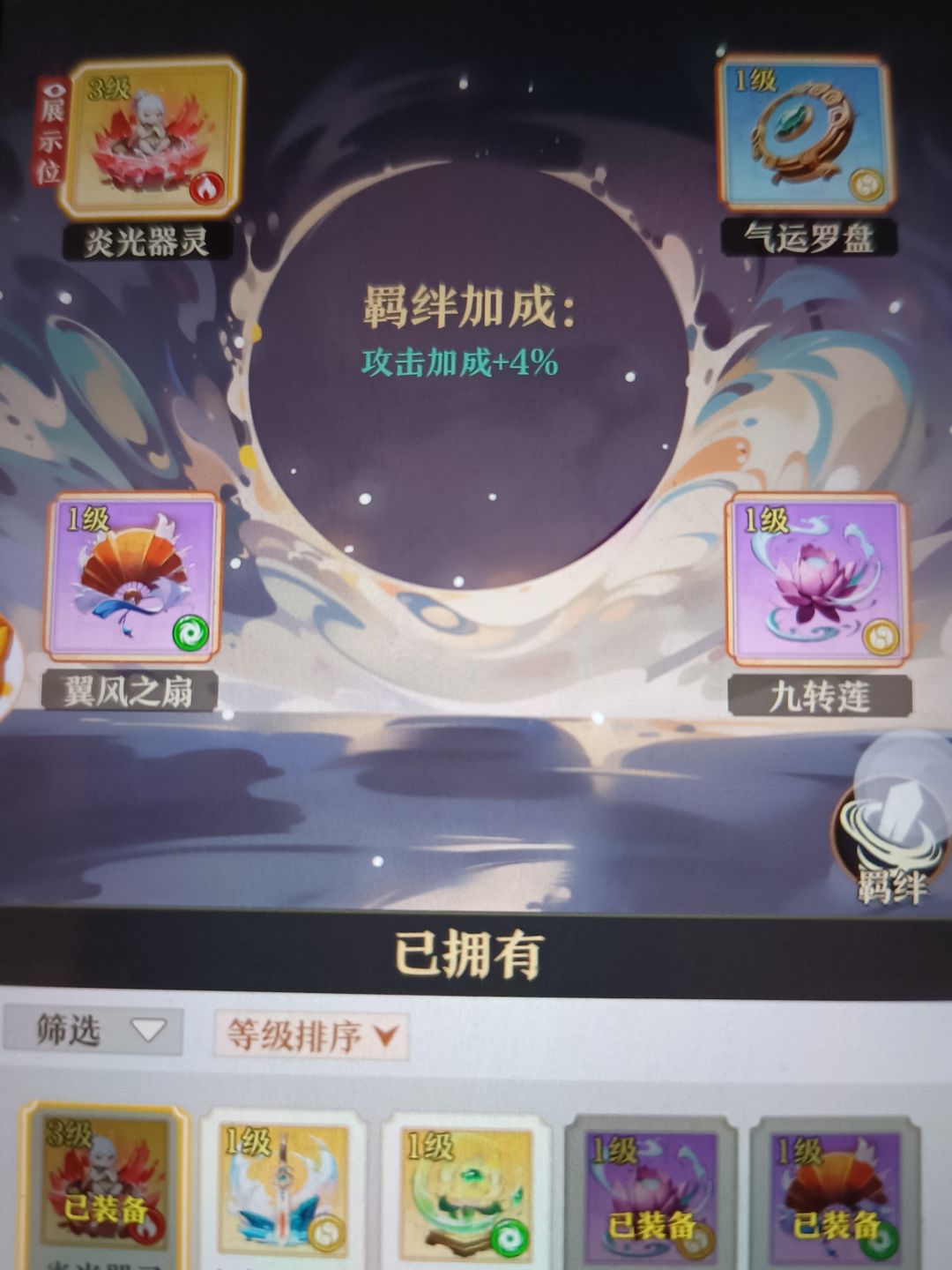 人:人皇天命剑,天命经轴 组合:攻击加成4% 火:炎光器灵,红莲天火镜, 组合:暴击率3.5 不要羁绊组合:人皇天命剑,炎光器灵,天风玉盏,翼风之扇 附属技能:火暴击率,风破甲,人闪避,人攻击加成,