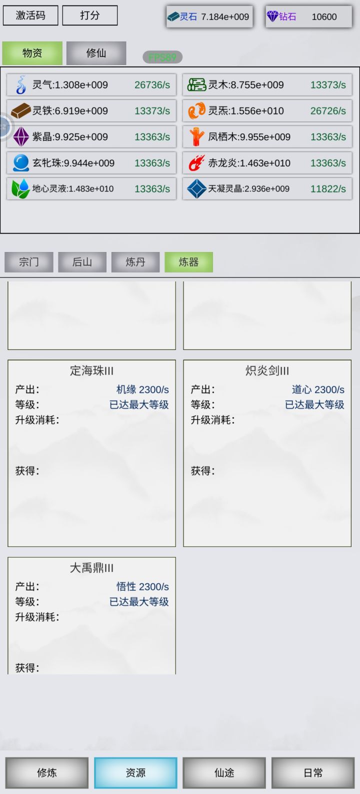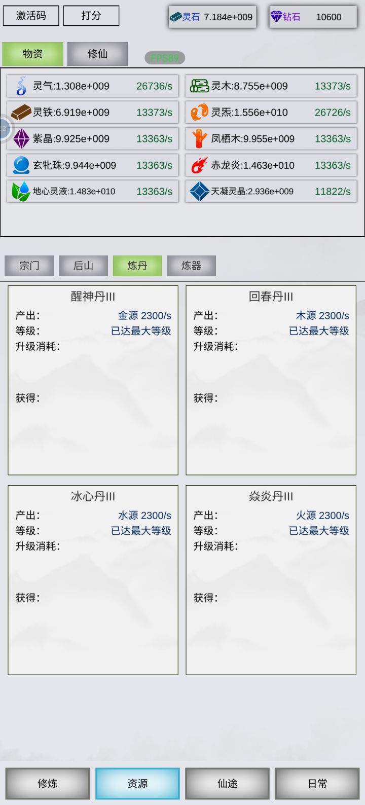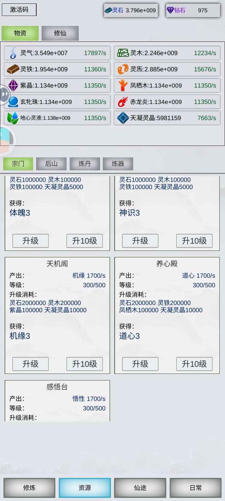 灵木,灵铁,金木水火土+5种材料,已全部最大等级产出,最后再点满大型灵池+大型空间裂缝+轮回丹,需要76天,目前毕业。