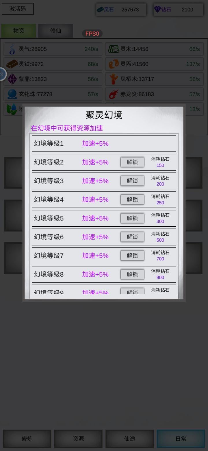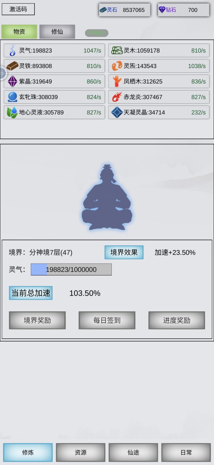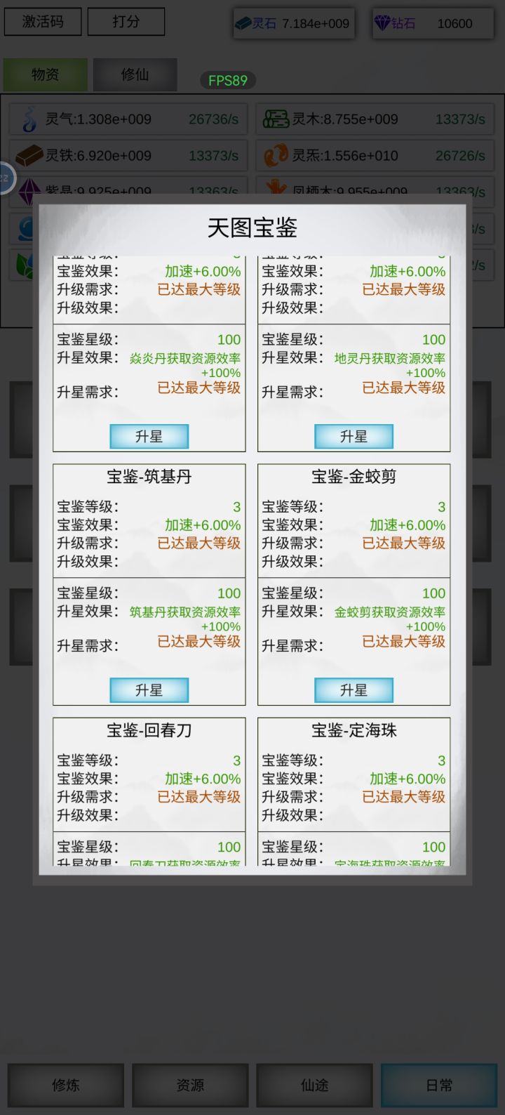 灵木,灵铁,金木水火土+5种材料,已全部最大等级产出,最后再点满大型灵池+大型空间裂缝+轮回丹,需要76天,目前毕业。