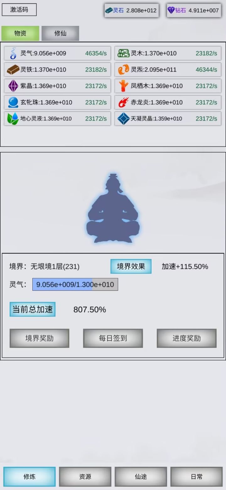 灵木,灵铁,金木水火土+5种材料,已全部最大等级产出,最后再点满大型灵池+大型空间裂缝+轮回丹,需要76天,目前毕业。