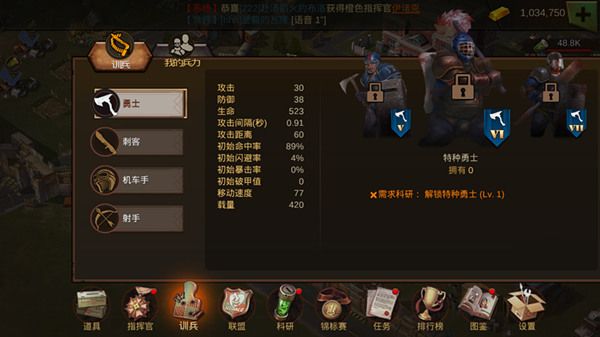 综述:训兵系统是玩家生产士兵的核心渠道,而士兵则是玩家战力的主要组成部分。1、分类区有训兵和我的兵力两个大的页面;2、玩家点击哪个兵种的兵营进入,则左下方区域的相应兵种处于激活状态;3、中间的信息区域,显示右边滑动区域相应类型兵的数值信息;4、当相应兵种正在训兵中,该兵种分项页签显示码表icon,该兵种没有处在训兵状态,则码表icon不显示;5、共四个兵种:勇士、刺客、机车手、射手,可以