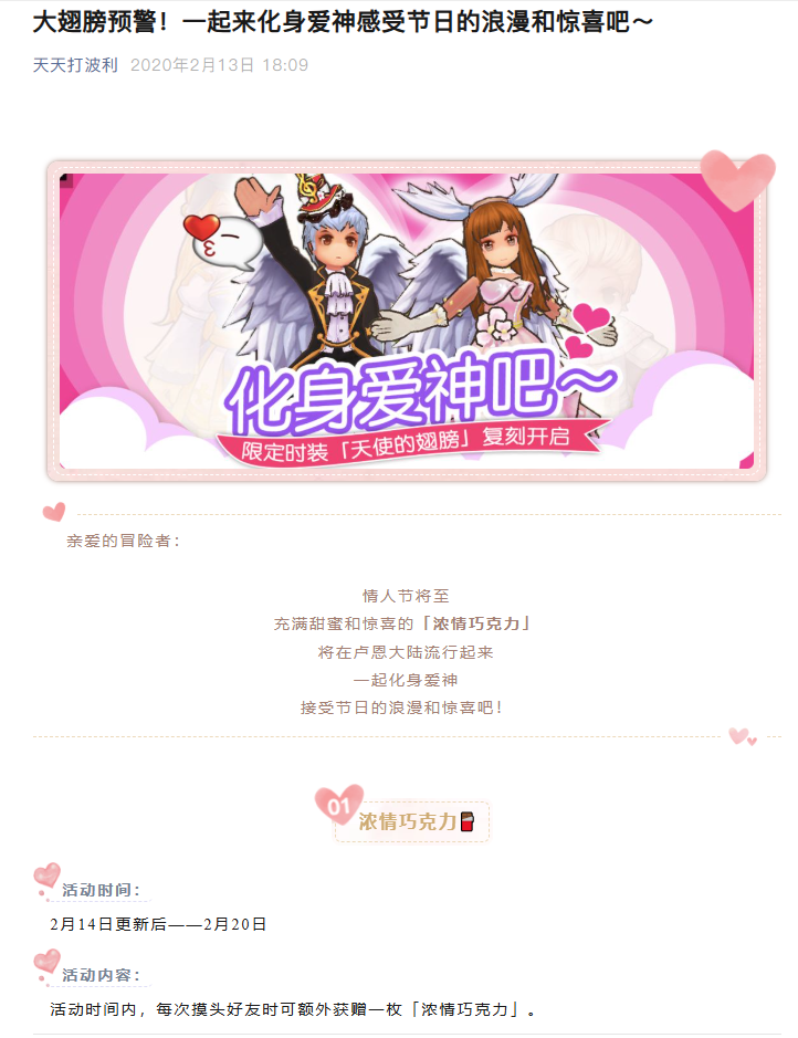 各位策划大大、运营爸爸们,小的给您磕一个了!🙏 今天翻天天打波利微信公众号,看到2020年2月13日情人节活动推文,瞬间破防。那年我还是个高中生,囿于学业、囊中羞涩,终究没能为当时的女朋友买下“”天使的翅膀“,这件装扮也成了我游戏生涯最大的意难平。 六年了啊!整整2190天! 这六年我经历了什么?