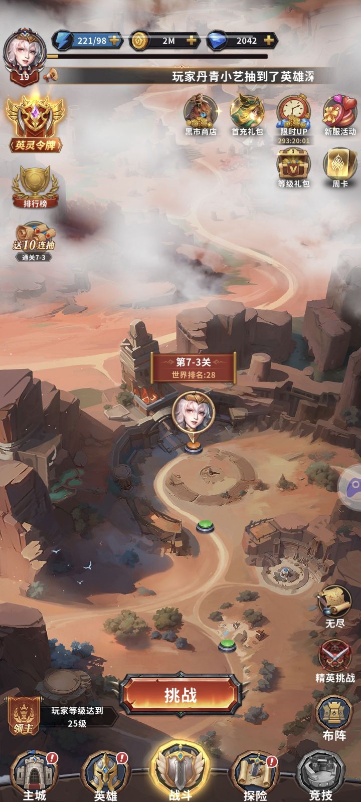 总结:无尽刷英雄碎片和武器升级材料,精英关卡刷英雄升级材料,高阶铭文,高级铭文合成以及升级材料,钻石买金币(主推)或者宠物进阶材料或者体力(主推)或者进秘境材料,主线纯属无聊刷关卡解锁精英关卡主线战斗里的挑战,只需要培养两个英雄就能打多了就分解继续换继续合成,多了大概率打不过,开局死灵骑士最佳,不行就刷,刷到再打,推荐圣光游侠加死灵骑士宠物鹿,进阶技能得开启,之后考虑升星,符文只要合适升级不难