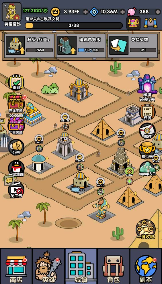 核心战斗是纯数值向的,类似卡牌游戏5V5的战斗流程,无需手动操作,只做战前配置即可。大地图有阶段性变化,类似文明的演变过程,建筑进驻对应属性的英雄,可以实现自动生产,是金币资源的主要获取方式。