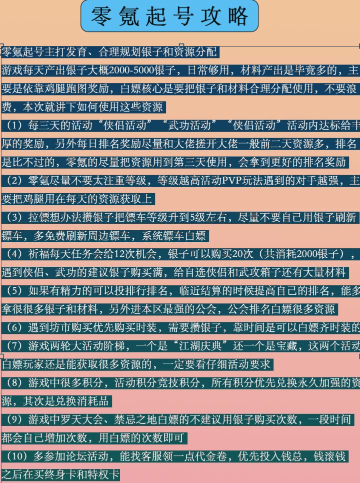 这款游戏我玩了将近一个月拉,从测试开始玩,对游戏的玩法也算是了解的差不多拉。零氪起号主打发育、合理规划银子和资源分配,游戏是好游戏,玩的很舒服,下班打打活动,上班摸摸鱼,很休闲自在游戏每天产出银子大概2000-5000银子,日常够用,材料产出是毕竟多的,主要是依靠鸡腿跑图奖励,白嫖核心是要把银子和材料合理分配使用,不要浪费,本次就讲下如何使用这些资源(1)每三天的活动“侠侣活动”“武功活动