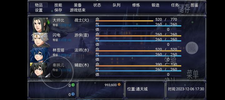 开局先对话两人 队友入队 在次对话领取武器后领取新手礼包里面一千金币(934677150)买两个红尘两个镇地 前期药品没用直接卖掉1800金 买两个八方两个神射 现在一级怪都是秒杀 本游戏血量也影响攻击然后装备上出发。主角战士建议修炼加点加攻击和血量,每一点都是1:10闪电游侠是双倍修炼点,每一点1:4攻击魔攻自选没有虚拟键的左右手同时点击屏幕呼唤菜单存档注意:血量低的时候回1级怪的图恢复