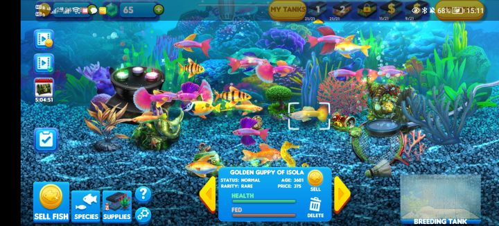 环境到四级,配合魔法鱼的加成,鱼根本死不掉,这个金色孔雀鱼说是最难养,结果是到现在都好好的,前两个缸的鱼基本上不用管,有一回是近三个月没玩,结果这两个缸里的鱼还活得好好的