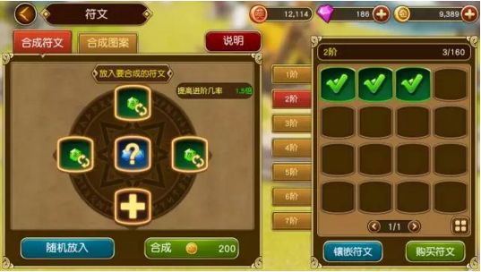 勇士会慢慢成长,而符文也不例外,等到手中的符文开始增加时,我们就会发现拿到好的符文以后,低级符文就没用了。这时,我们可以打开符文背包,点击下方的“合成符文”,进入“合成符文”的界面,可以看到左侧有五个矩形,其中四个是空格子给我们放入同一品阶的符文。例如,放入3个绿色符文,接着我们点击“合成”按钮,则会花费相应的金币进行合成。合成的结果是具有随机性的,比如4个攻击力合成出来可能会是防御力,4个蓝色