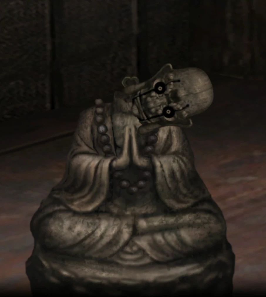 第五章 1.(马面石像)点击石灯,放入【冥珠】,河面出现石板路 2.点击石像手上的铜钱剑,查看游戏提示,完成小游戏(将铜钱剑变为全黑) 3.获得【黑色五帝钱】 4.把【黑色五帝钱】放入石像的天眼中,石像的眼睛睁开 5.点击石像的眼睛,查看游戏提示,完成小游戏 6.在石像的嘴中获得【黑色勾玉】 7.用【石剑】捅开石像的胸口,获得【黑心】 8.点击秤,把【黑心】放到秤盘上;查看游戏提示,完成小游戏(点