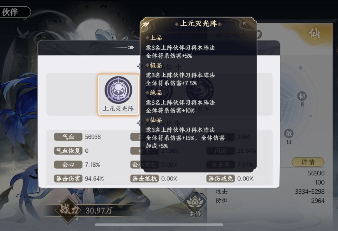 点我看往期攻略 交流裙:751261445 开服第二天攻略: 攻略就是继续先爬镇妖塔,在冲主线,第一天的我冲到了160层(氪佬估计能冲到250+),第二天很多玩家都到金丹期了,会解锁两个副本南天别院和东海之渊。 PS:有大佬带则刷南天别院,个人闯关刷东海之渊,南天别院的奖励会好一些(氪佬请无视) 一、阵容搭配建议: 围绕着阵法加成来搭配角色,尽可能保证(输出-控制-恢复)三角平衡,当然前期什么