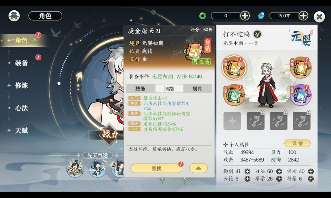 委托人:哈哈哥 委托原因:被封号 状态:0氪 配置:紫色化神金刀武技,元婴金剑身法,化神金刀绝技,化神木刀神通 核心词条:金刀武技概率触发绝情,暴击,元婴金剑身法暴击,化神金刀绝技5层绝情和持续时间。化神木刀神通刀魔2秒以上,暴击 装备是元婴5红色剑套,头盔打了个3回蓝, 其他全爆伤, 面板攻击1.08到1.68 暴击49 爆伤178(天赋,它点的纯刀。会心都没点。不缺蓝,金属性果子5品只吃了10