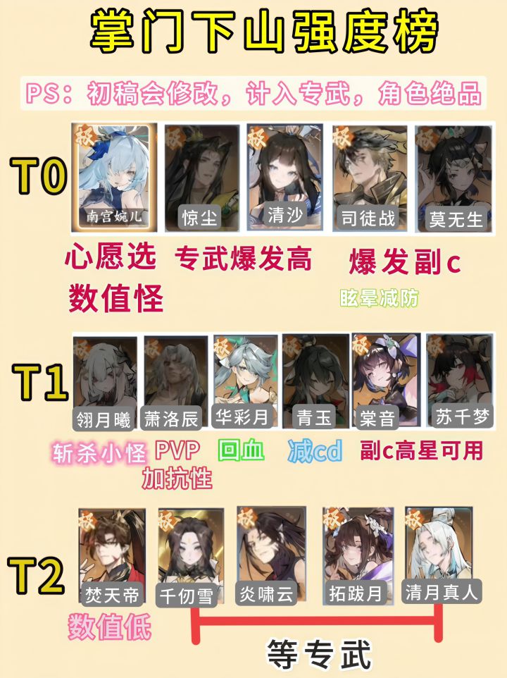 ⭐最新更正(已制成图片,见另一篇)✨由于金刀流派的强力 T0改成:焚天帝、拓跋月、翎月曦(吸血) 原T0降至T1,南宫婉儿也是。 新手心愿先挂翎月曦 抽到本体后,转焚天帝。————————最新流派↑——————➤因为可以上阵3个角色 1主战+2助战 所以,没有明显分层 毕竟星级/专武,也很重要 很多角色,都是专武/绝品变强的➤个人向推荐队伍 『南宫婉儿』+『司徒战』