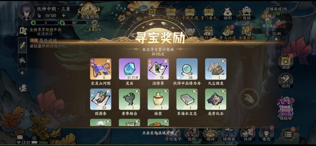 省流: 金色藏宝图*6 灵石31w 沽修草19 中品伙伴修为丹*34 固源参*22 一堆没用的礼物 #掌门下山游戏 #掌门下山0氪