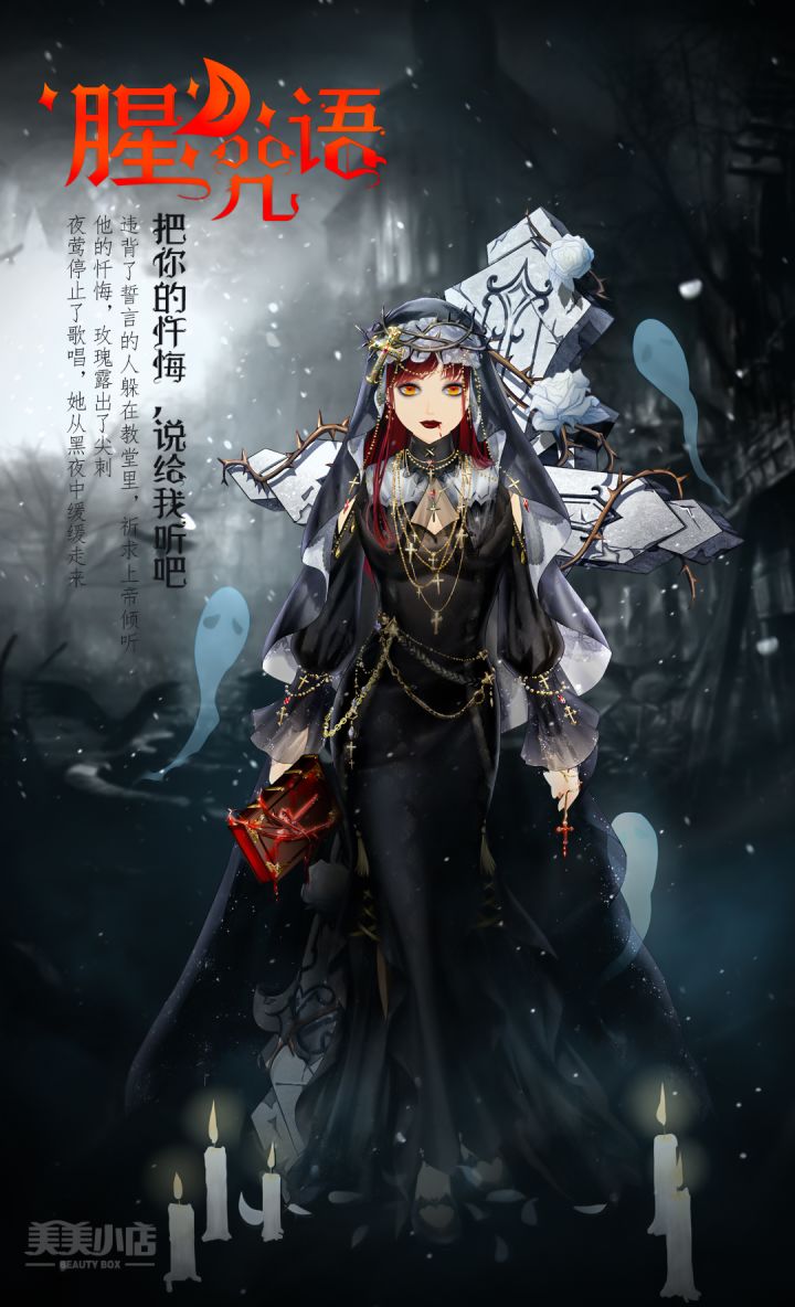 滴答...滴答...是时针走动的声音,滴答...滴答...是水滴落下的声音,你听见了吗?时间总是趁你不注意开小差;你看见了吗?那滴水,它是鲜艳的红色。亲爱的美美们,万圣节,它悄悄的来了,可爱的南瓜灯、甜甜的糖果和温柔的爱人。如此奇妙的夜晚,美老师早就为大家备好了丰富的福利和华美的新装,Knock knock ,Trick or treat~新装上线:腥月咒语10月31日,万圣节限时上线一轮