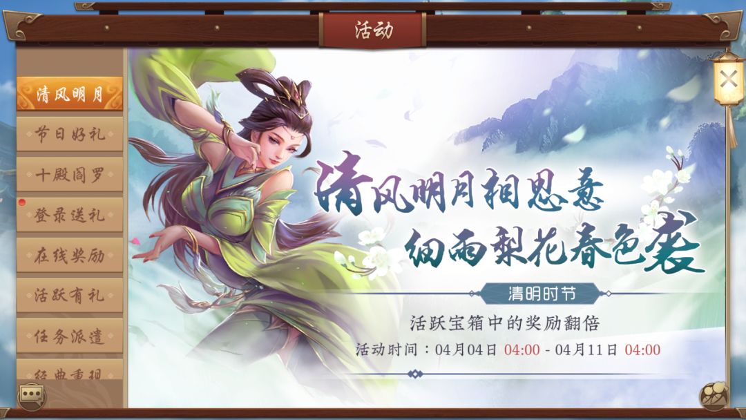 各位亲爱的老爷们: 大家好!我们将于04月03日 15:00进行临时停服更新,由此带来的不便还请谅解。对您带来的不便我们深表歉意,为此我们为大家准备了维护礼包,请在维护结束后查看邮件获取。 更新时间:04月03日 15:00 -15:30 更新类型:iOS、安卓版本停服更新,玩家开服后在游戏内自动下载更新补丁。 更新补偿:仙币*1500 更新公告: 1、清风明月活动将于2023年04月04日