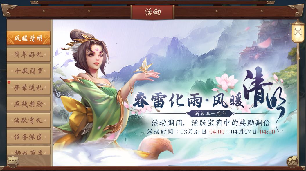 各位亲爱的老爷们: 大家好!我们将于03月31日 15:00进行临时停服更新,由此带来的不便还请谅解。对您带来的不便我们深表歉意,为此我们为大家准备了维护礼包,请在维护结束后查看邮件获取。 更新时间:03月31日 15:00 -15:30 更新类型:iOS、安卓版本停服更新,玩家开服后在游戏内自动下载更新补丁。 更新补偿:仙币*1500 更新公告: 1、清风明月活动将于2022年04月01日凌晨0