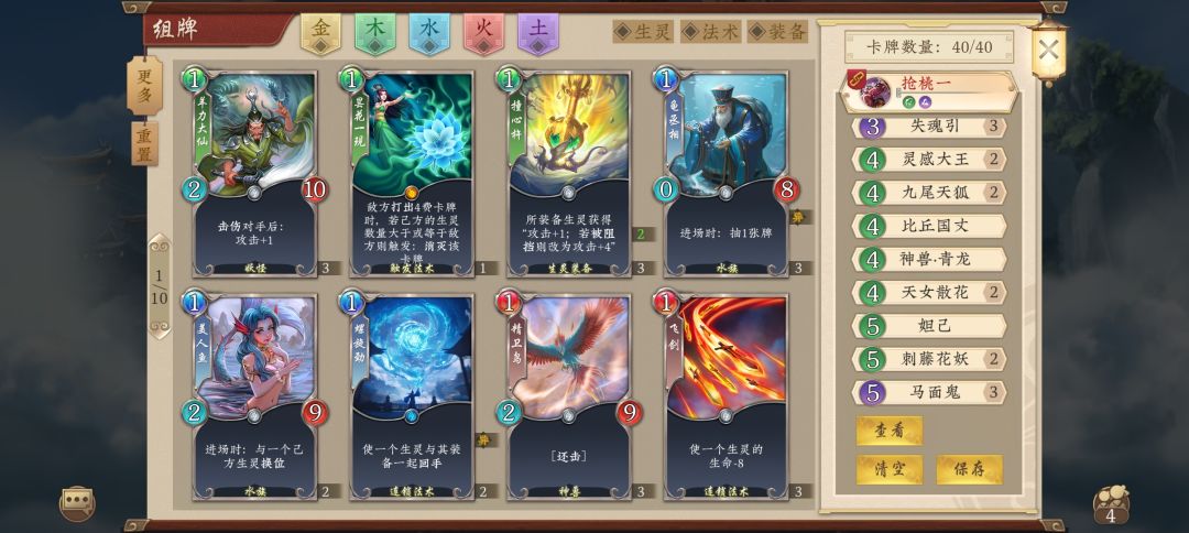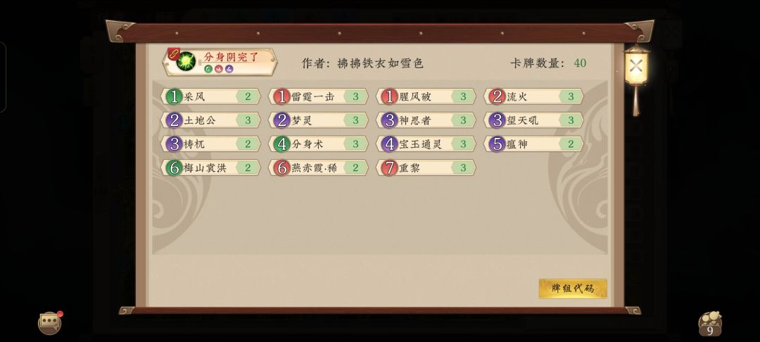 本次更新内容 加入笑红尘×2: 能有效对碧落,针对面很宽,上可截碧落三味天地同寿天人五衰归元还阳赤鬼大阵无敌牛屎,下可抗拆装化为灰烬往生无常断水防火灵封一梦还乡。提升了整个卡组对抗碧落、对对、教主还阳和鬼龙一刀的强度。 披沙拣金-1: 笑红尘能有效对抗拆装,再加上道高一丈装备很难被拆,因此减少此卡数量,防止卡手。 止水替换为道高一丈: 笑红尘补强了抗拆装能力,所以止水换成针对面更宽的道高一丈,保留