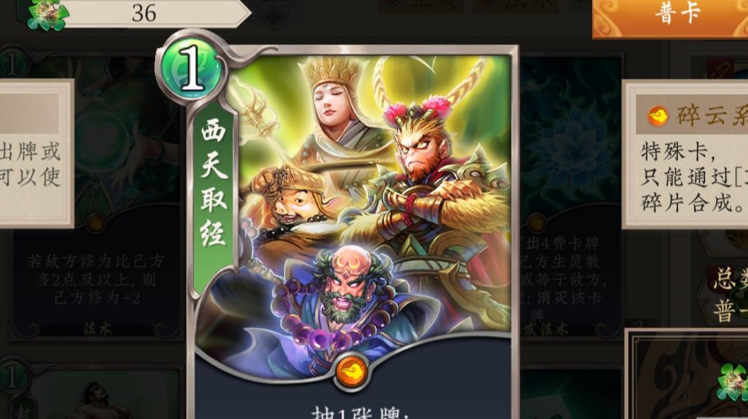 加强一下取经卡。 西天取经 1费木系连锁法术 抽一张牌,乙方场同时上有唐三藏/金蝉子,孙悟空/斗战胜佛,猪八戒/天蓬元帅,沙悟净/卷帘大将,四个圣灵时候,乙方胜利。 两个唐僧 斗战胜佛 金系佛门 7-5-20 〔延迟〕3费消灭敌方场上同一类别所有生灵,攻击+X,主角生命+2X〔X为消灭生灵数量〕 天蓬元帅 金系天将 5-3-14 进场时,乙方金系生灵攻击+X,水系生灵攻击+Y〔X为水系生灵个数,Y
