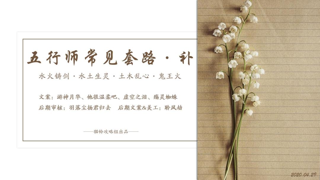 五行师常见套路·上 https://www.taptap.com/topic/11769784 五行师常见套路·中 https://www.taptap.com/topic/11826505 五行师常见套路·补 https://www.taptap.com/topic/11986552 【关于补充篇】 文案换人,初稿待审,辣鸡美工还是我! 文案:月华游神(水火),他很温柔吧(水土),殇灵蜘蛛(鬼火