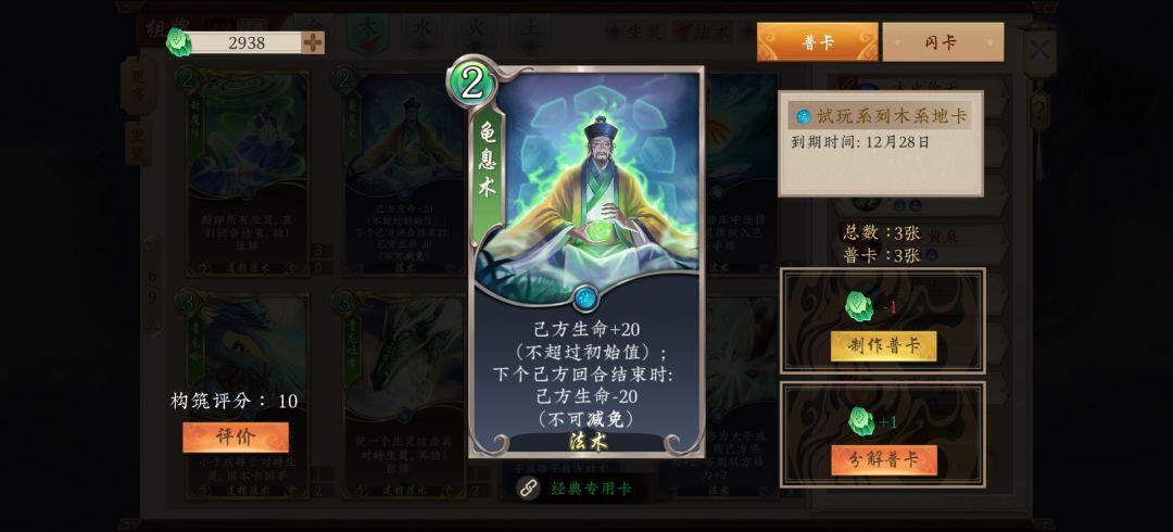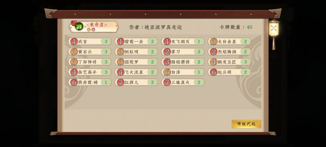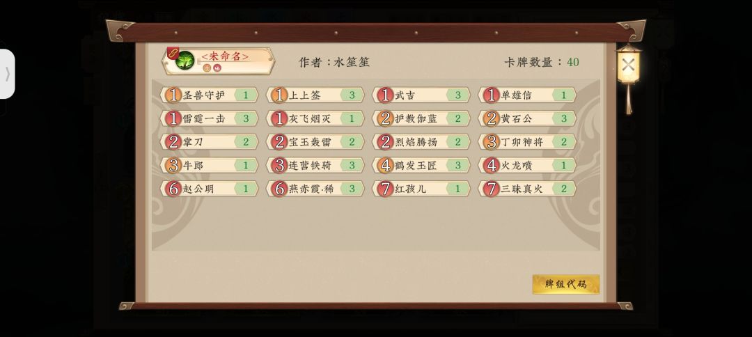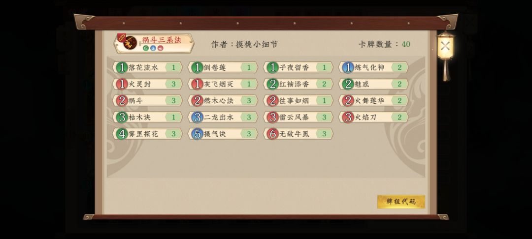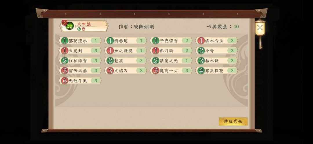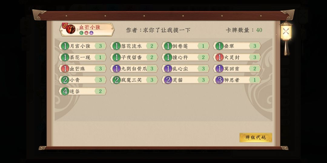 卡组如下 首先声明,此卡组并非我的原创,是我从以前的精品贴里翻出来的老卡组,然后根据环境修改而成,而我用此卡组在通天塔12连胜上了尊,足以证明此卡组在当前环境依然具有很高的强度,有图有真相。 下面是我的基本思路分享 我们的门派选择神木林,神木林的门派技能可以补充我们的手牌,在后手或对面有跳修和压修的手段时也能为我们提升修为,可以根据情况换成金山寺。 这套卡组的构筑有四种卡构成 分别为:直伤卡,过牌