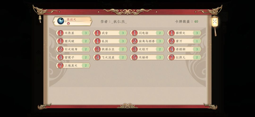 先贴卡组 第一次写攻略,不喜勿喷。这套卡组比较适用于地阶到天阶的新手,这里主要讲解一下对战时的技巧,还请大佬多多指正。 这套卡组至少要有两张铁扇公主,有无敌牛虱当然带着更好,具体卡组可以根据个人情况调整。 首先我们把一次对战分为三个阶段:前期(1~3修),中期(4~6修)和后期(7修以上),这套卡组在前期和后期强度都很高,接下来我们分阶段进行讲解。 首先是前期,留牌以低费生灵和法术为主,抽到红孩