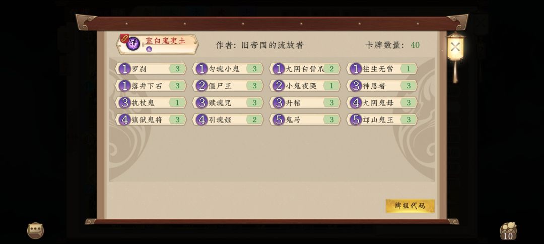 ★娱乐卡组 ★★较弱卡组 ★★★较强卡组 ★★★★极强卡组 1.无限九婴 ★ 先用碧海神通把鲤鱼精换给对方,圣兽守护让鲤鱼精不用掉血,即可无限九婴不断触发闻太师从而斩杀。 2.无限还乡 ★★ 祭炼小鬼提供法力,让繁花似锦复制大量一梦还乡,重复使用一梦还乡复活小鬼+3法力,从而继续使用繁花似锦复制一梦还乡,最终用泰山王斩杀。