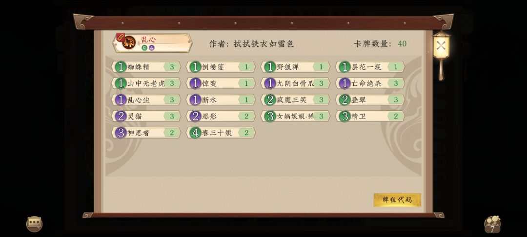 先上图(自己已经改动后的图),在玩了几十把推荐卡组的原套后,自己改了一下,又玩了四十多把,发现该卡组改后打法可以更多变一点,故提出一些自己的思路: 1. “天女散花”和“乱飞花”实属锦上添花的卡。可以去除或者减少至2张。 理由: 如果照原卡组带3张散花+3张飞花,那么在占空间的同时会引起“到底修炼哪张卡”的困惑,首先要搞清楚的是,伏击+祈神使+猴子一定是要凑齐的,如果凑不齐就必须留检索卡,那么很容