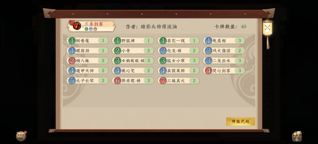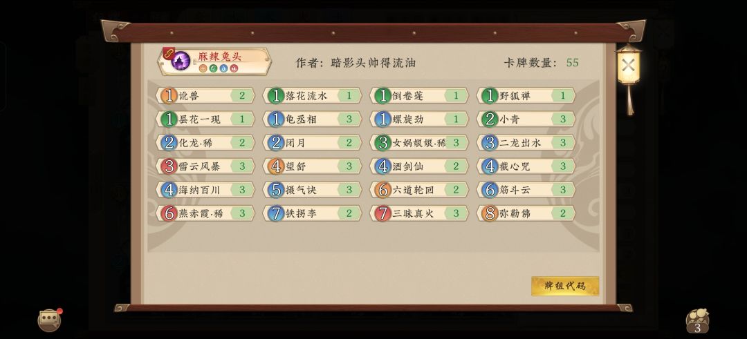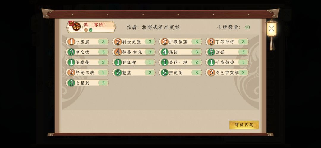 ★娱乐卡组 ★★较弱卡组 ★★★较强卡组 ★★★★极强卡组 1.秩序一刀 ★★ 用花仙子和祖龙获取大量因缘仁,用自然秩序让因缘仁和碾压置顶,配合破戒僧斩杀。 2.水木莲香 ★★★ 分身莲香相当于让每个生灵每回合+3攻,甚至还不怕被阻挡浪费伤害,非常强力,只要用反制牌保住场面即可轻易获胜。 3.金水佛音锁 ★★ 蔡文姬配合佛音锁,遁甲天师可以复制佛音锁,南华老仙重复使用佛音锁。