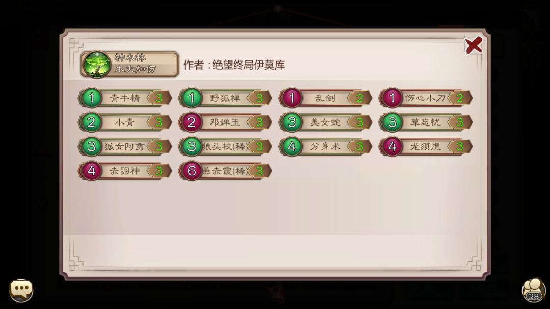 主要打法:增伤配合多次伤害轻易解决对手的生灵,草忘忧和野狐禅防法术。 备注: 克制依赖核心生灵或生灵少的生灵套,打一般的生灵套也有很大优势。 狼头杖主要用于克制水土等卡组,并非必要。 燕赤霞打高修卡组很好用,也非必要。 木火加伤跟木火雷神是不同的卡组。 增伤对宝光佛无效;伤心小刀对唐三藏有效。 对阵豆柱、鬼吹之类的装备流卡组几乎没有胜算。 神木林用于修炼。 核心卡:狐女阿秀/美人蛇/赤羽神/龙须虎