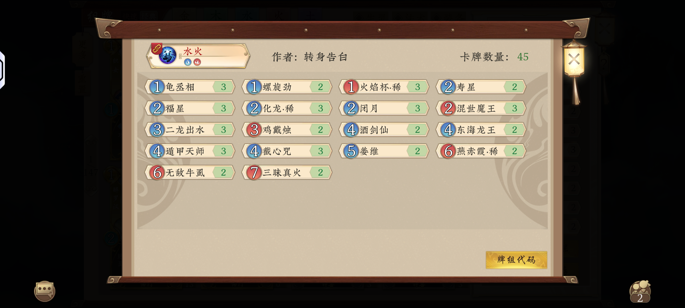鲁肃改版后补资源能力很强,凌云岛都难以占到资源优势。 抛砖引玉一下新卡组 思路是用白虎、横公鱼、催命拼生灵和场面资源,用海公子拼法术资源,用锦毛鼠维护combo来耗死对面。