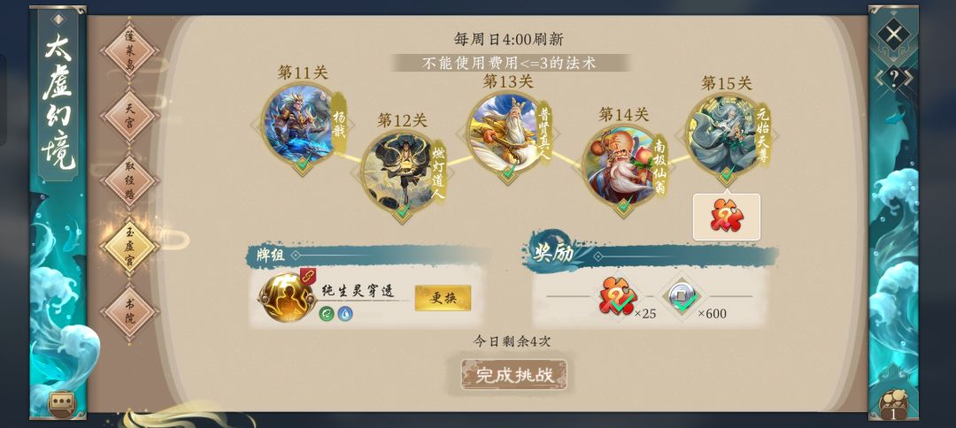 第1-5关使用玉虚豆柱 第6关 金木优质生灵激情对撞,巫山神女和开山决打开局面; 其实也可以使用玉虚汤雷 第7-10关使用玉虚汤雷 第11、14关使用玉虚穿透 第12关惧留孙 关公鲤鱼+回手+针对装备 截心咒防六道轮回 第13关普贤真人 苦海无边+土系法术打出场面优势 第15关混沌兽 穿透+血妖