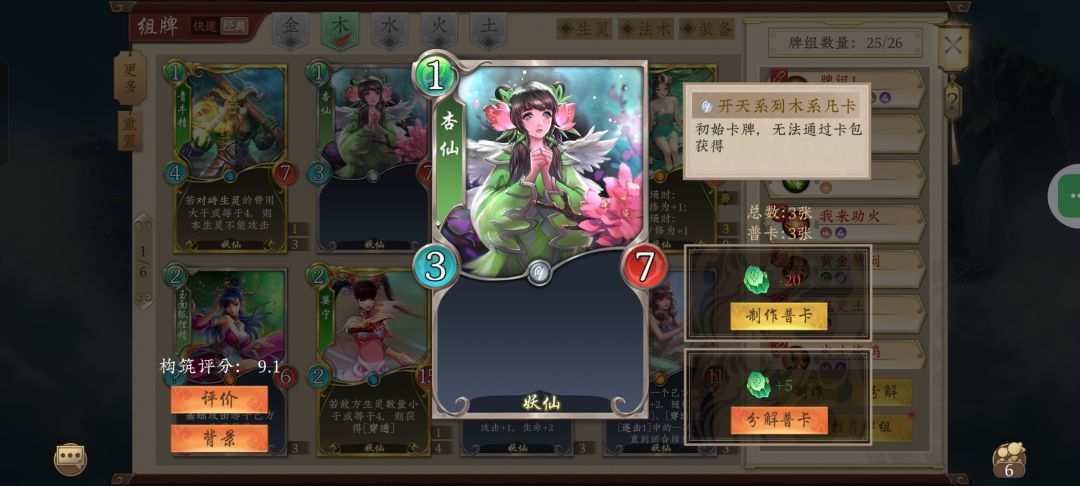 妖仙体系收益牌不多(其实五行师哪个收益牌都不多),加上五行师机制对非进场生灵不友好,笨得很。能玩的卡组不多,希望通过数值带带,做成类似化生金那样。由于化生金更多还是靠灵童白虎珈蓝限制对手才有的强度,妖仙限制少点,应该需要给更多数值。 杏仙,1费,3:7 己方回合结束时:变化为杏仙 还是和之前一样,每回合变化给黄袍刷攻击。配合羽扇刷牌也行,不过羽扇本身就不缺触发的牌,增强有限。 恶作剧,1费 敌方打