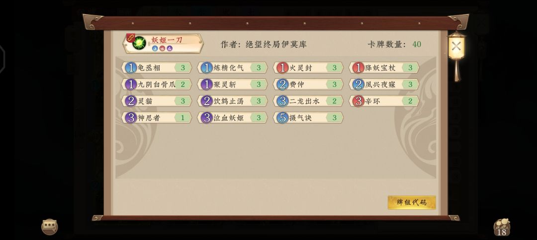 ★娱乐卡组 ★★较弱卡组 ★★★较强卡组 ★★★★极强卡组 ★★★★★无敌卡组 ★★★★★★bug卡组 1.妖姬一刀-饮鸩止渴 ★ 妖姬一刀又有新的翻倍卡了,不再需要在对方回合斩杀;相比之前的构筑把金系换成了水系使过牌更流畅。 2.土木血魔 ★★★ 血魔+小卓每回合打8,如果还有清肠稻和有来有去就能每回合32伤害;巫山神女既能过牌又能加攻,妖气冲天、伍秋月、丐仙也能过牌使套路可以稳定达成。 3.水