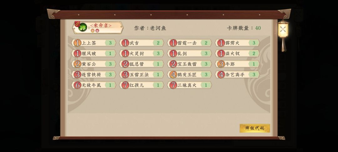 还是来一场堂堂正正的正面决斗吧 (吐个槽 当前版本金系太弱啦 不锁进场怎么玩?) 锁了进场没有聚宝盆也没有资源 站场生灵如灵吉菩萨费用太高 于是想到了反弹还击 再瞄到多心经和借火 于是做出如下一套有过牌的金火卡组 一费:上上签或雷霆 二费四费:优先锁进场(跃龙门先用扈三娘骗) 注意生物站位还击靠边其余挨着 方便混元伞buff 普化天尊用于斩杀(女神也可以 但是太吃聚宝盆 且比普化晚一回合 见仁见智