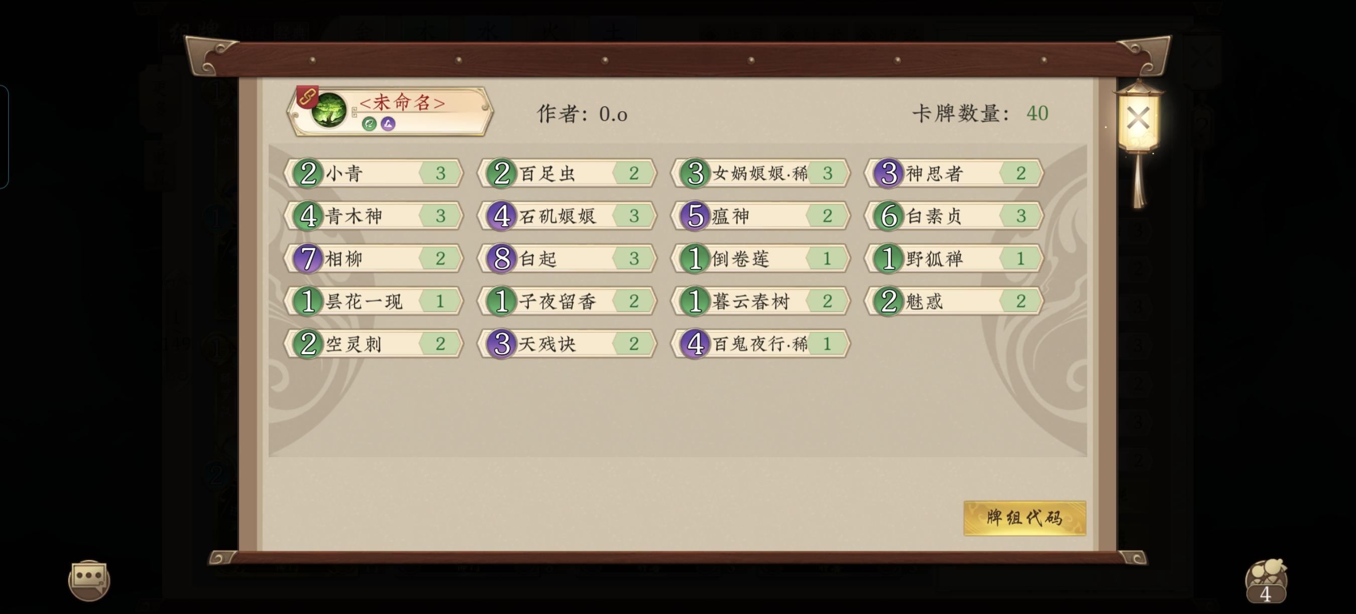 卡组思路-石矶娘娘配合青木神化身真正的稀有卡,还可能有额外进场惊喜-相柳可空下给对方压力(可考虑给卡组配穿透)-后期白起解场 大白镇场-暮云很灵活 配合相柳 或给生灵补满血卡组核心:百足虫!-女娲少就考虑破魔镜,或弃牌流(但没这么稳定)--------卡组代码H4sIAGKcRWkA/wEtANL/HoAGvAGdwOygnMCXYJdg4cAExcHDAcNBRQI/gU9BSw