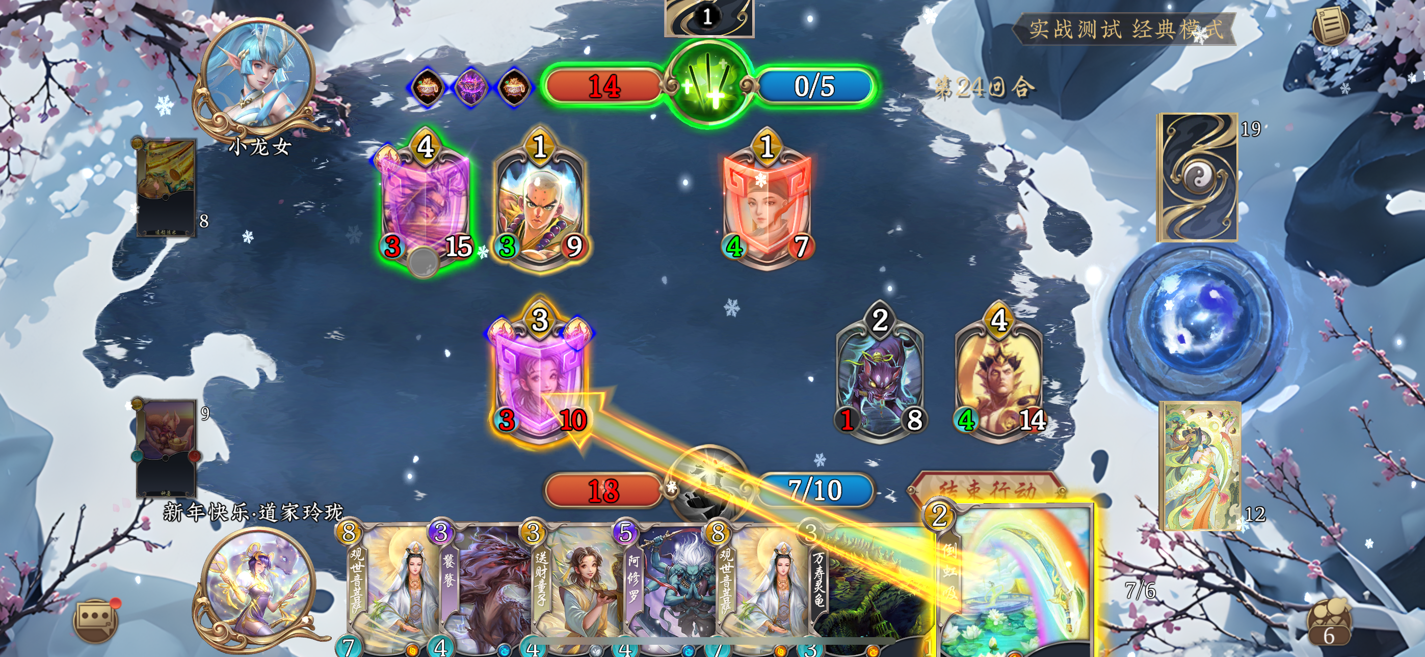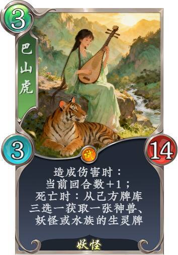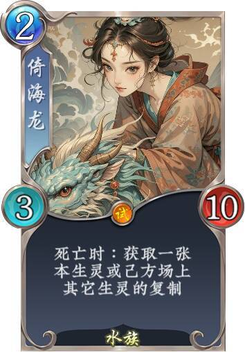 水蛇精,5费0攻17血水系水族生灵,此卡攻击力为场上所有不为水蛇精的水族生灵攻击力之和。离场时:将墓地中一张除水蛇精以外的水族生灵置入手牌。假戏真做:3费土系连锁法术,己方主角血量-2,使上一张法术或生灵牌的进场效果变成:令目标对象弃置一张牌。东海夜明珠:3费水系主角装备,己方水族生灵出场时己方法力加一,己方水系生灵死亡时己方抽一张牌。(一回合一次)。六神无主:2费土系连锁法术:当对方场上