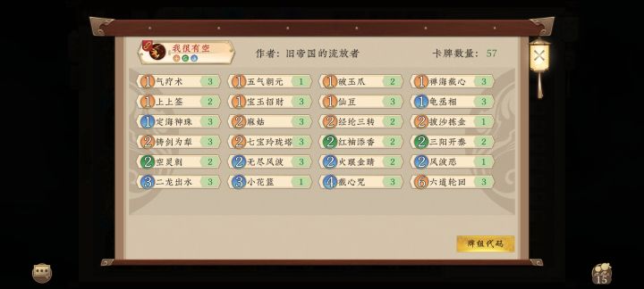 已经努力控住了,可惜还是没打过。(虽然我打的有点失误)[表情_泪目] 自己尝试了一下这套卡组,一般5修场上有孙悟空,手里捏着截心两回合就能取胜,就算对面努力铺满场,一个孔宣也可以清场[表情_举手] 针对卡:草忘忧加白虎加超度[表情_斜眼笑] 赶紧开发一套,三生杯打他个措手不及[表情_送花]
