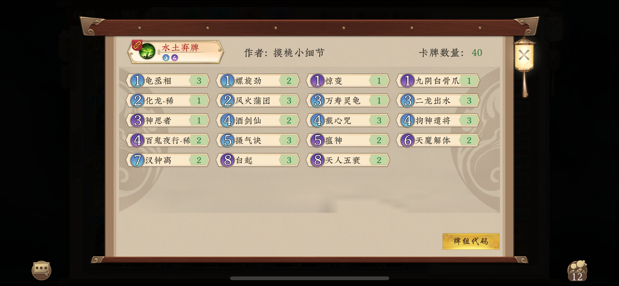禁水,另外找了套萌新能用的。代码:H4sIAKomXWkA/5NrZLNxvrng6oJOhT4HL0V2xxsJ1xZ0J1xVCErsP9Ag49ik3hTFDAD8gMDHJQAAAA==思路:起手留铸剑和燃木或三转,让对面铺怪压血,方便后面用掌心雷。金山寺撑过四怪变六怪。燃木或三转清场后,铸剑控住8费。之后不要修炼,吃天地同寿亏牌。用直伤突脸。打完牌库直伤后,用无定法门拿对面的颠