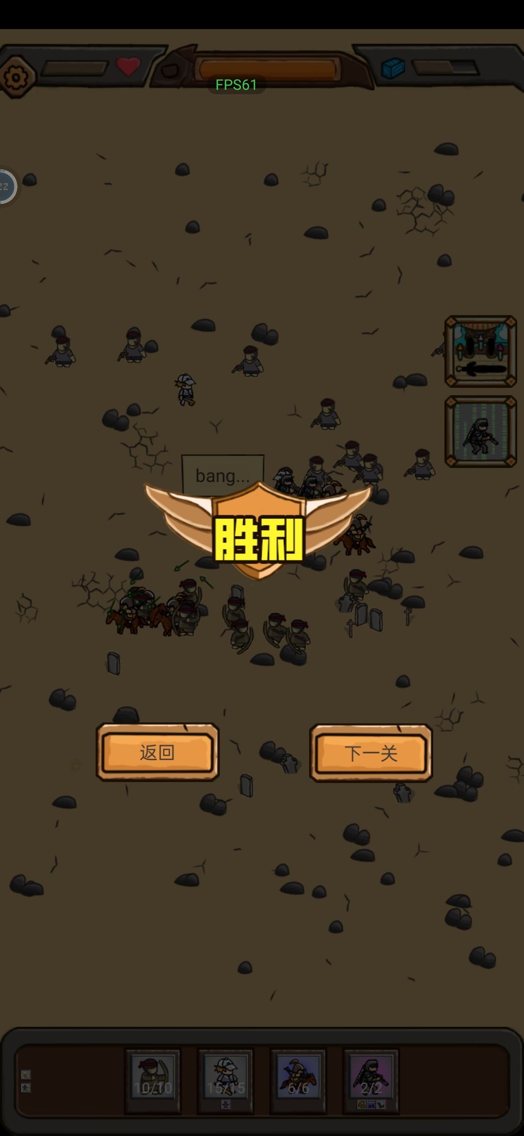 投石车必出系列!丧尸第十关暂时过不了。。。不知道是不是兵种问题。。。打了几十次都卡在大boss过到中间就开崩。。。 →→→→→→→→→→→→→→→→→→→→→→→→→ 新手:按流程走,把能打的都打了!基本上三个地图在第4关卡住,新手入门结束! 入门:这时基本上勇士,弓箭手,投石车,这三个新手兵种已到手,然后开打仙侠!基本上打多几次能通关仙侠地图!这时有了剑阁,开打丧尸! 丧尸既3-4关卡住好久,试