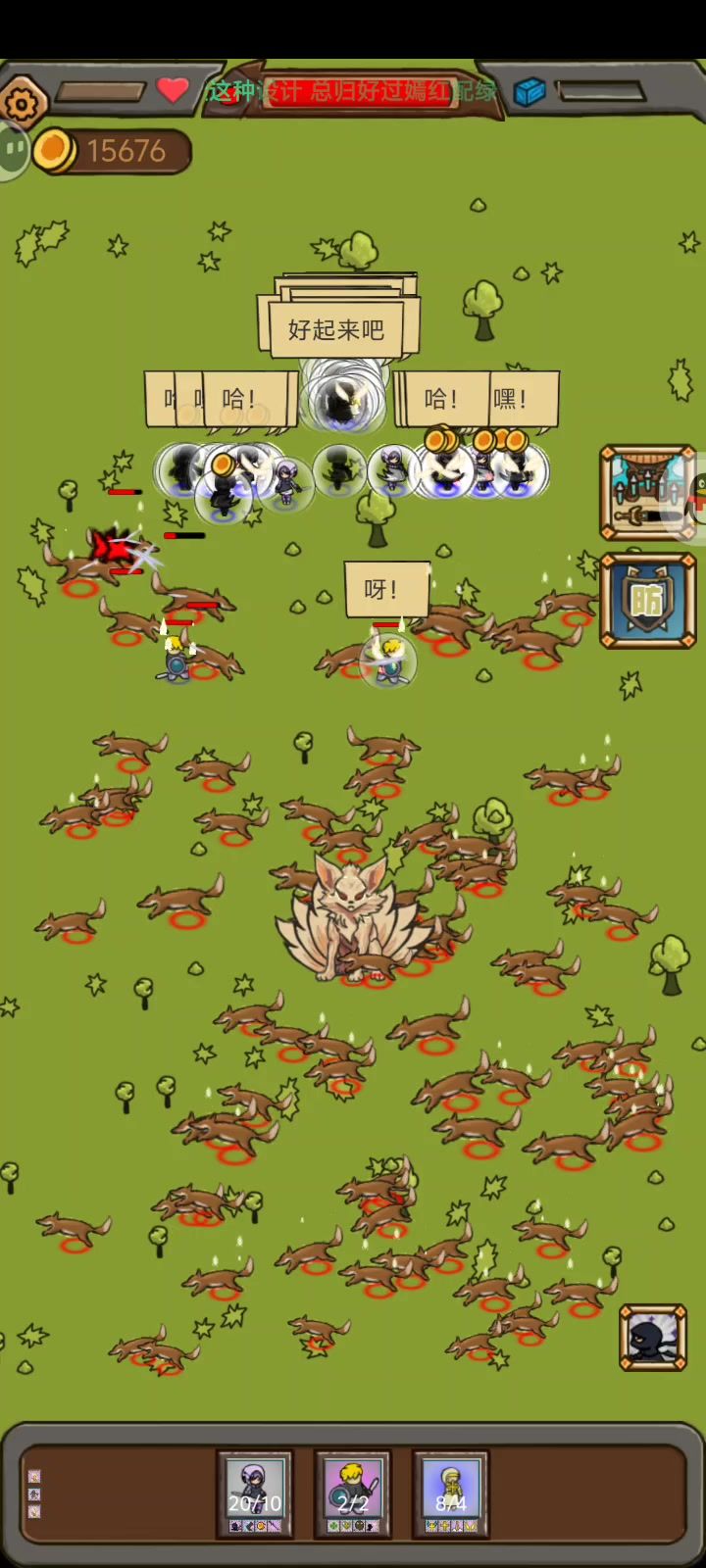 😂无意中搞出来的,真是好看又好玩 前期成型特别快,根本不需要担心翻车,持枪出来既成型 持枪3魔弹+双生,或者2魔弹2双生 学习双枪后魔弹直接翻倍,持棍的摊牌只学到2级,千万别升3 炸弹学枪械专家加攻速后就像下雨一样 再加上勇者信念人数翻倍,不过要注意勇者另外两个技能不能学,需要一直死刷新信念 前排上来有老鼠和音响抗一下,音响记得带回血 最后感觉战舰不是特别适合,可以换成投石车,妥妥变成冰雹雨!上个